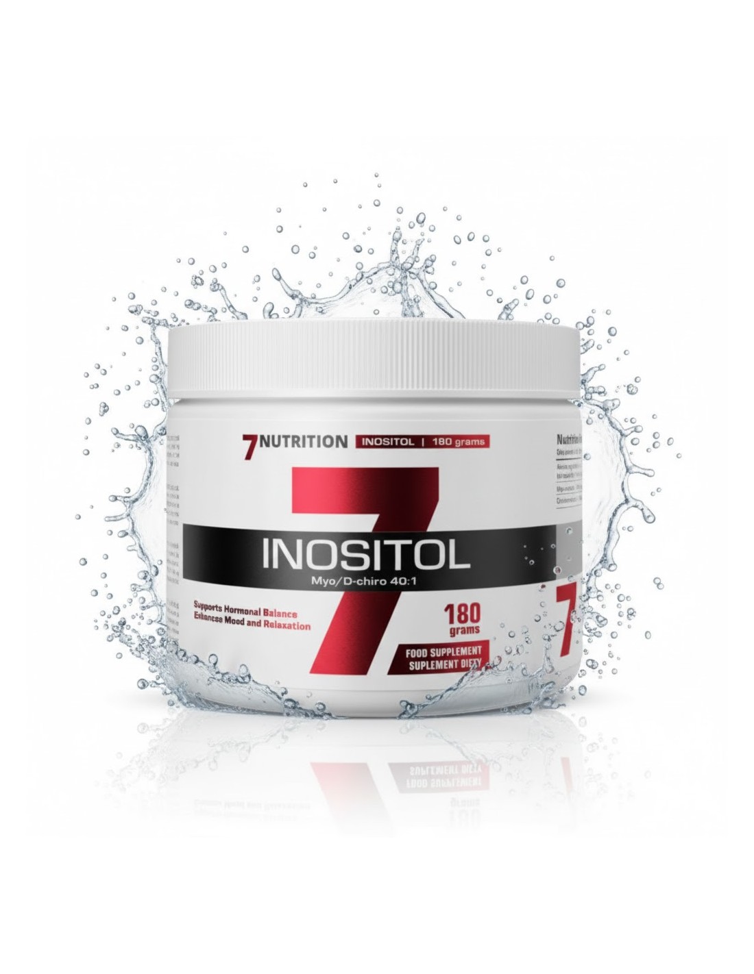 Inositol 180 g de 7Nutrition es un complemento alimenticio en polvo que combina Myo-inositol y D-quiro-inositol en proporción 40:1.
