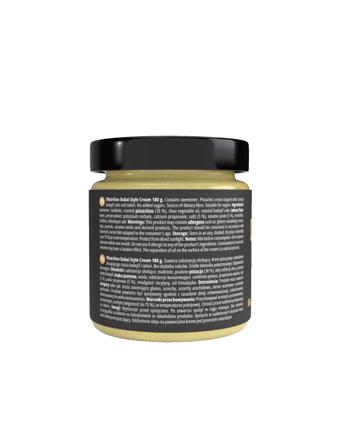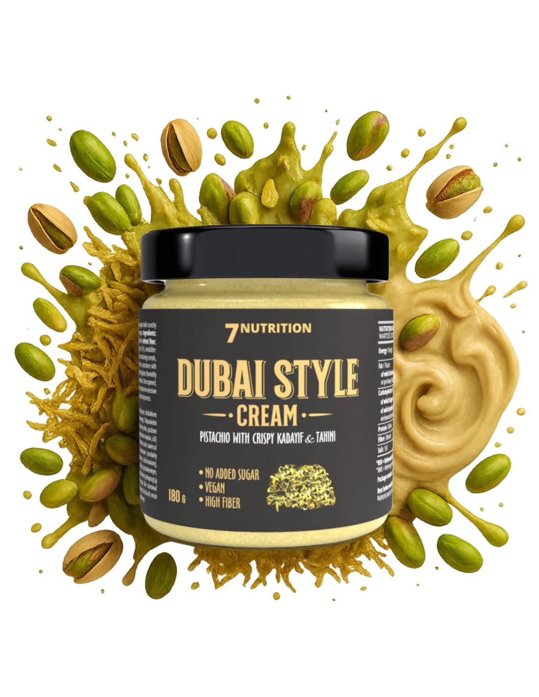 La Crema Estilo Dubái de 7Nutrition (180 g) es una crema gourmet de pistacho con crujiente de kadayif y tahini, ideal para quienes buscan un capricho saludable y diferente.