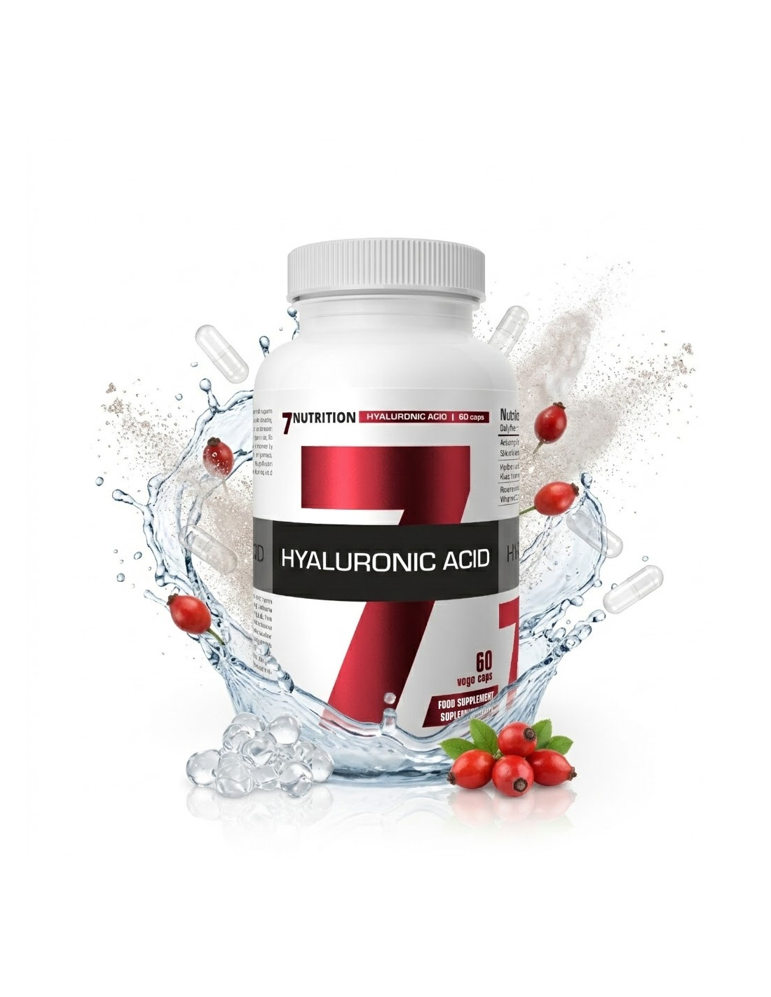 Hyaluronic Acid 60Caps de 7Nutrition es un complemento alimenticio en cápsulas vegetales que combina ácido hialurónico con vitamina C procedente de rosa mosqueta.