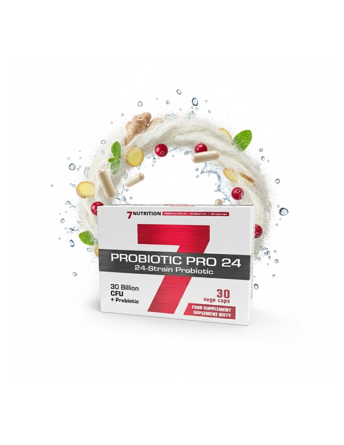 7Nutrition PROBIOTIC PRO 24 es un suplemento probiótico de alta potencia que combina 30 mil millones de microorganismos vivos procedentes de 24 cepas cuidadosamente seleccionadas.