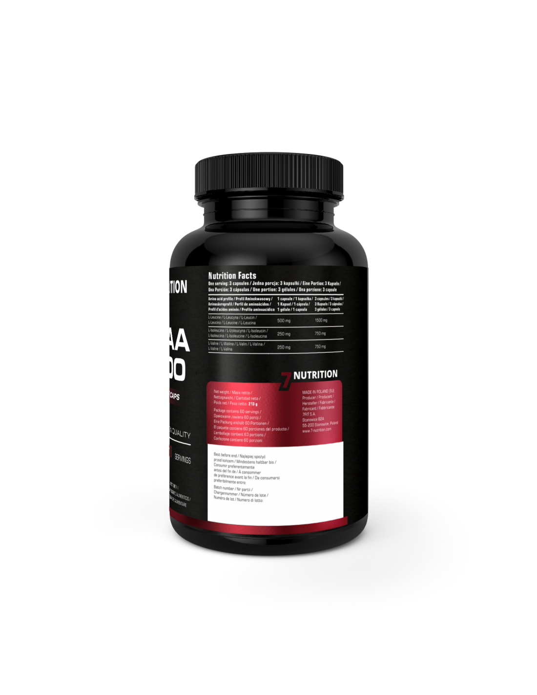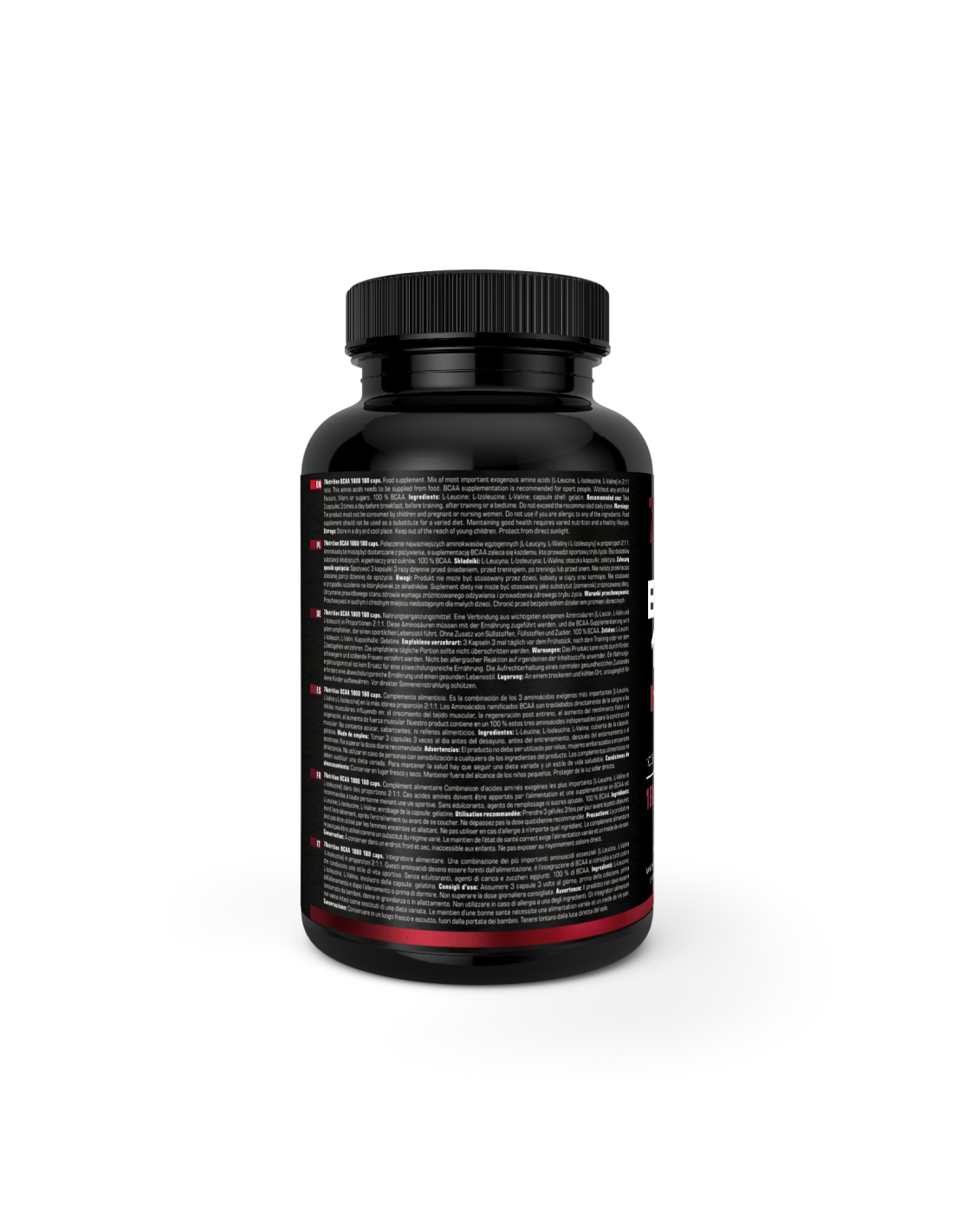 BCAA 1000 de 7Nutrition aporta los tres aminoácidos esenciales de cadena ramificada (BCAA): L-leucina, L-isoleucina y L-valina en proporción 2:1:1.