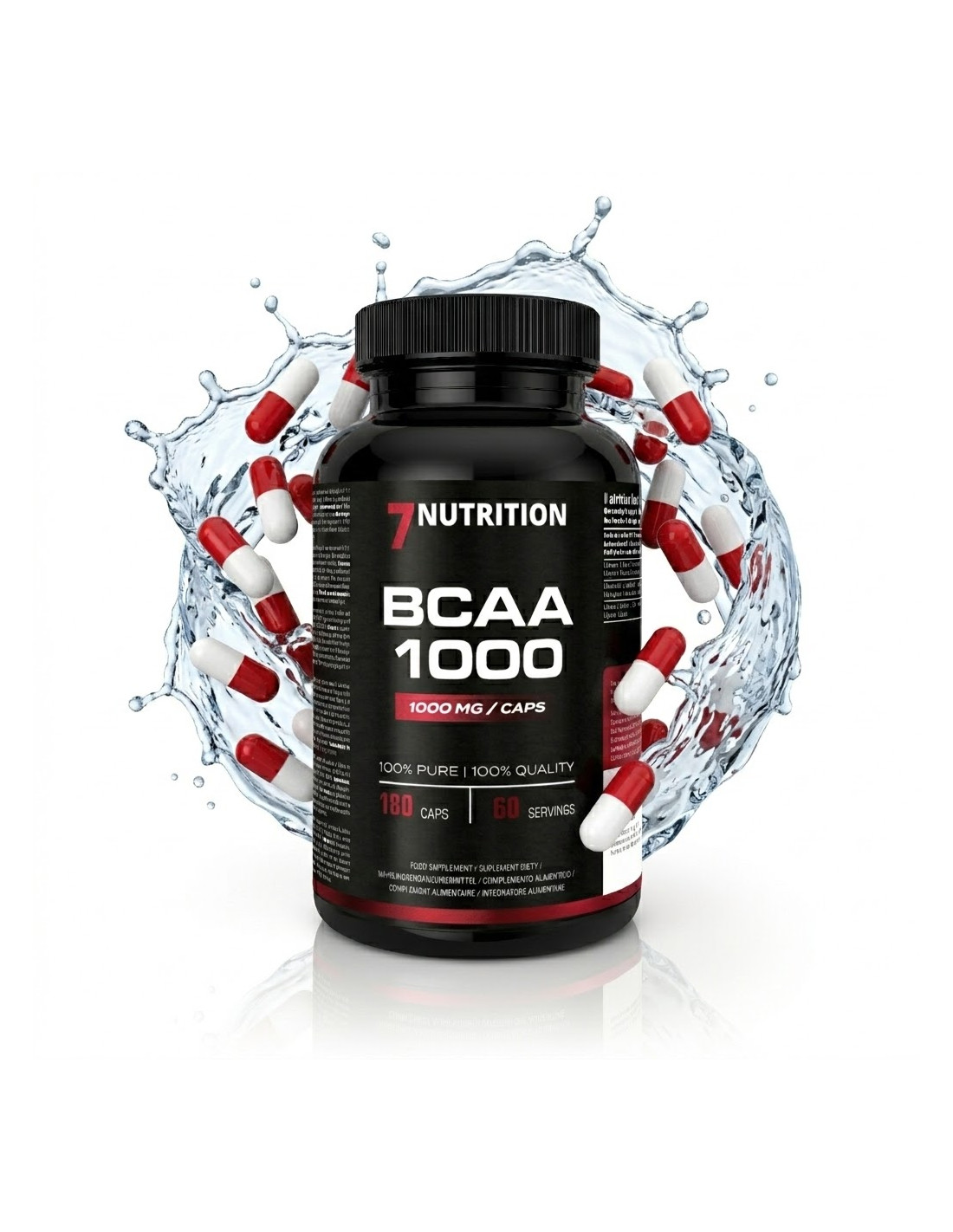 BCAA 1000 de 7Nutrition es un complemento alimenticio en cápsulas vegetales con aminoácidos esenciales de cadena ramificada en proporción 2:1:1 (L-leucina, L-isoleucina y L-valina), formulado para apoyar el rendimiento y la recuperación en deportistas.