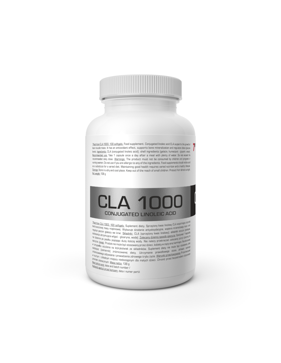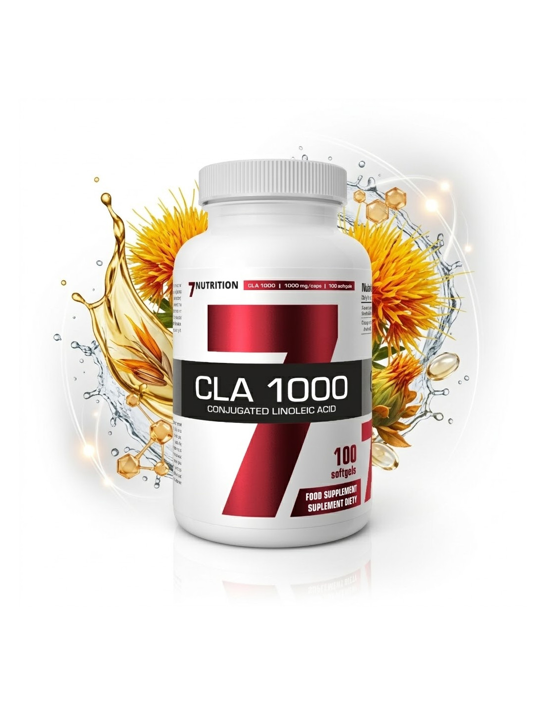 7Nutrition CLA 1000 es un complemento alimenticio a base de ácido linoleico conjugado (CLA), un tipo de ácido graso presente de forma natural en algunos alimentos, especialmente en productos de origen animal.